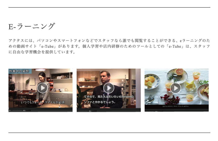 柳沢:弊社では、スタッフなら誰でもPCやスマートフォンなどで閲覧することができる、eラーニングのための動画サイト「e-Tube」を運営しています。個人学習や店内研修のためのツールとして活用しており、時間に縛られることなく、自宅や移動中と言った好きなタイミングで自由な学習が可能になっています。 特にスタッフの働き方は様々で、長時間勤務から短時間だけ働きたいという学生さんや主婦の方も多いですが、その一方でスタッフを集めた集合研修がなかなか行えないという課題がありました。また、限られた時間の研修ではすべての業務を伝えきることができません。そうした背景からエビリーさんにお願いし、6年ほど前に「e-Tube」を立ち上げました。