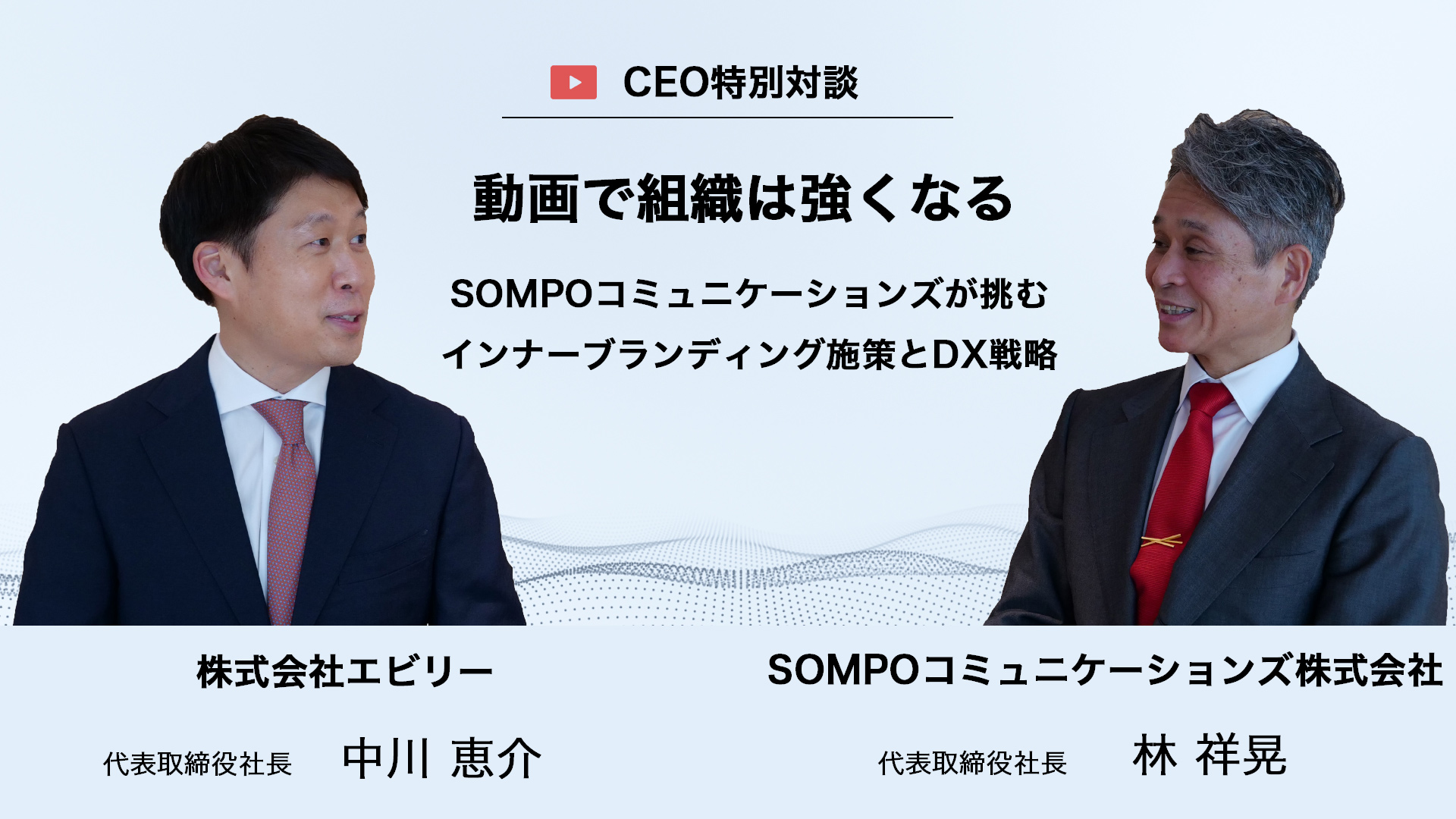 今回は「動画で組織は強くなる。S O M P Oコミュニケーションズが挑むインナーブランディング施策とDX戦略」と題し、S O M P Oコミュニケーションズ株式会社で代表取締役社長を務めていらっしゃる林祥晃氏をお招きし、エビリーの代表である中川恵介との対談を企画。動画を活用したインナーブランディング施策の取り組み、その成果や課題についてお話を伺いました。