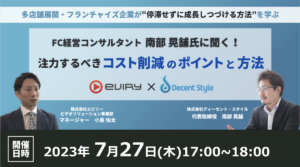 当オンラインセミナーでは、長年多くの企業でFC本部の支援を手がけてきた株式会社ディーセント・スタイル 代表取締役 南部晃舗氏をお呼びし、「コスト削減」という経営課題に着目して、フランチャイズビジネスにおける課題解決策や「動画」を活用した運用方法を導入事例とともに紹介していきます。